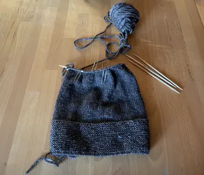 Another one that’s been sitting around a million years. I was doing this on two circular needles, but as I was narrowing it for the crown I think I reached a point when I needed to switch to double-points and didn’t have enough of them. It’s so close to done, and it’s also super soft and comfy so I need to finish this before next winter.