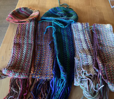 The construction of these is mostly done (there are a couple other colorways I might want to add) but they need to be washed and blocked. The scarves need fringe, and the hats maybe need pompoms.