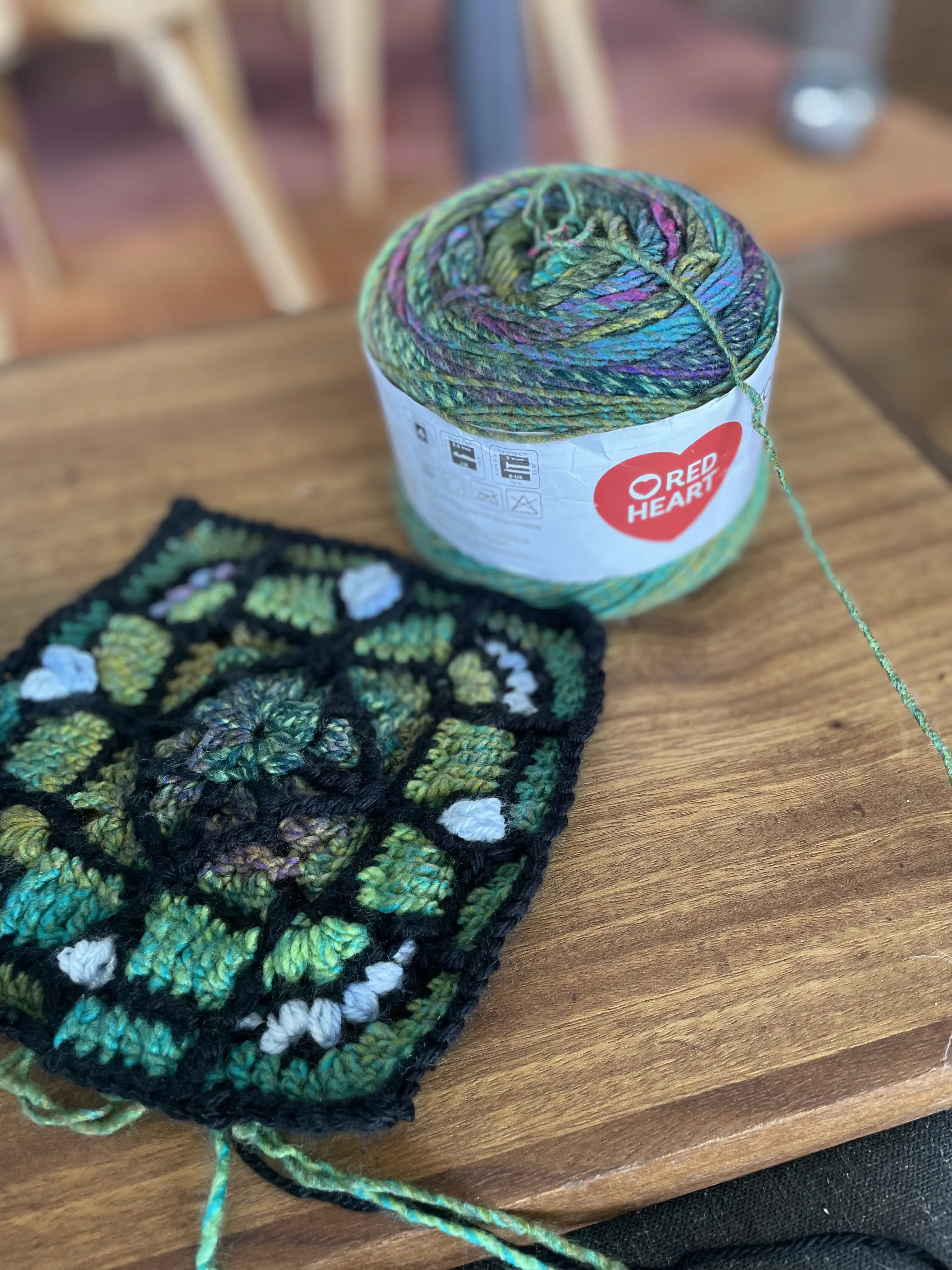 Anyway, the great thing about crochet is that you can make things that are small and nonlinear, so that the repeats in the yarn colors don’t get a chance to stack on top of each other! And that is why this blanket is bringing me so much joy. Each square comes out with a gorgeous blend of colors that make it look like stained glass.