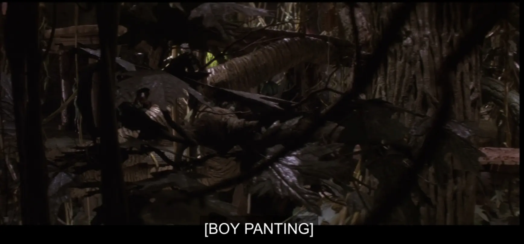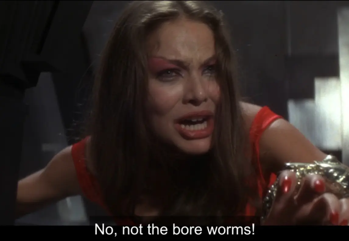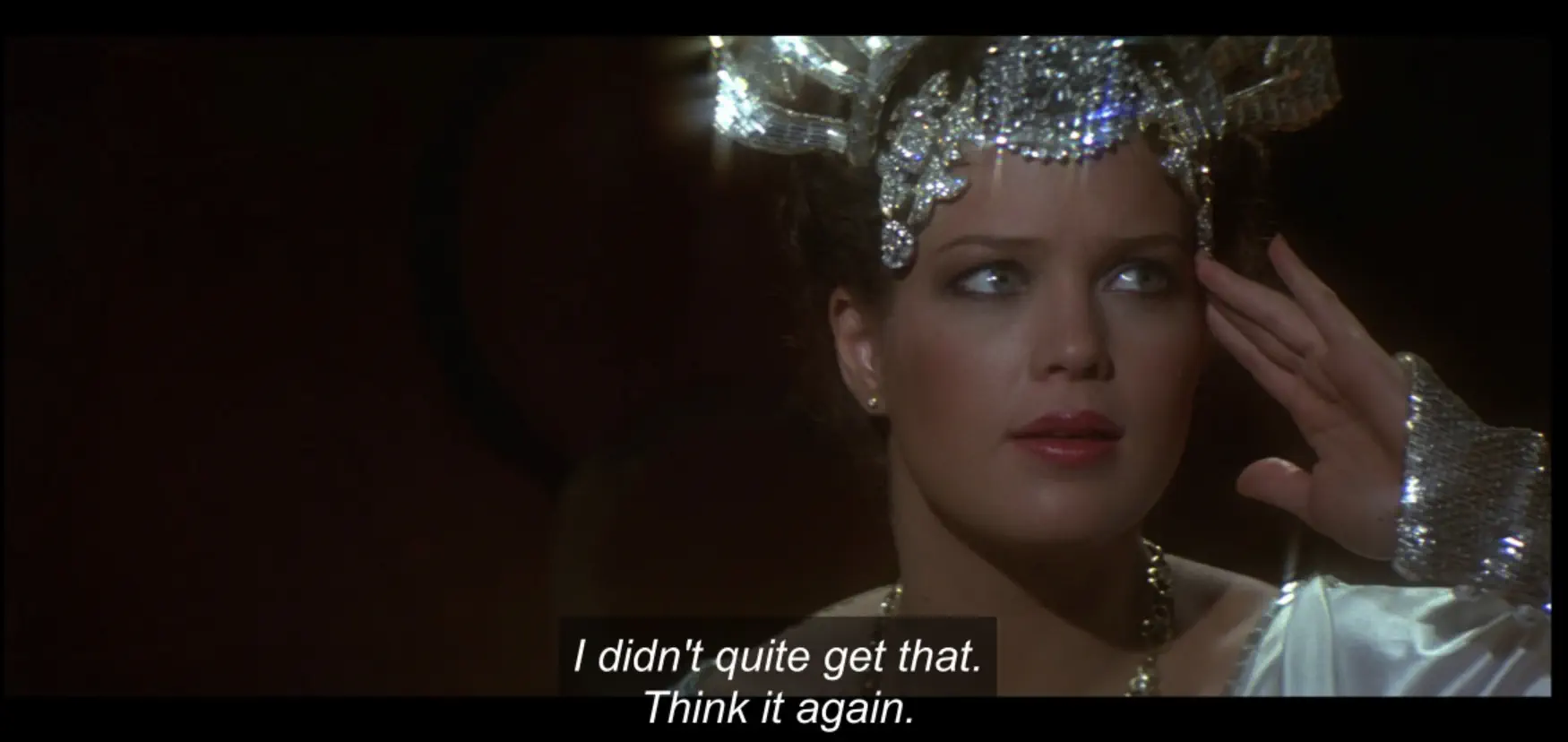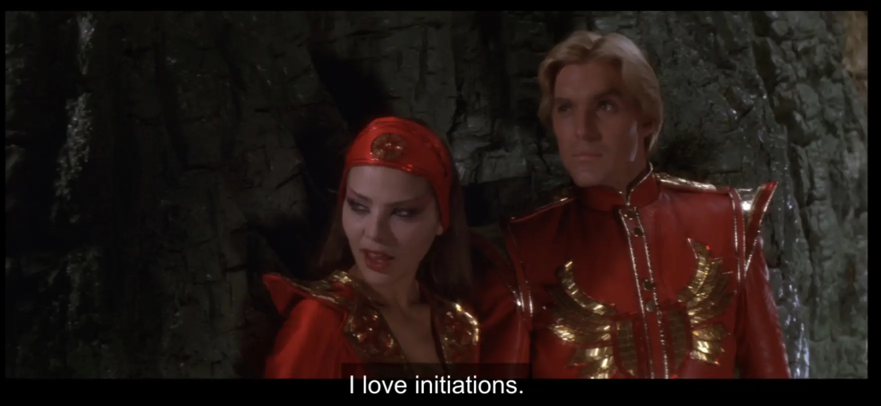 The actual initiation is a sort of treeman Russian roulette that involves sticking your hand into a hole in a stump and seeing whether the thing inside bites you. poisonous or not, I guess. James Bond Prince Barin is there with his sidekick, played by none other than Richard O’Brien, AKA Rocky Horror’s Riff Riff. We’ve really come full circle. (Also, without his Riff Riff makeup and hair, Richard O’Brien is kind of hot?)