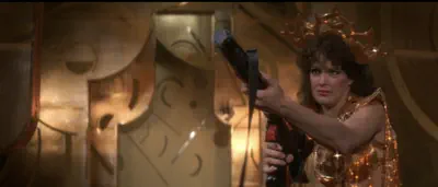 Dale convinces the servant who brings her the sedative aphrodisiac to partake herself. This is a much better idea than whatever Flash was trying to imply, because when the servant is blissed out Dale switches clothes with her and leaves her in the bed. She manages to get her hands on a phaser of some kind and takes out a bunch of guards with it, running barefoot and carrying her high-heeled sandals because she is a practical woman. This version of Dale kicks ass. And is way to smart to be with a dum-dum like Flash.