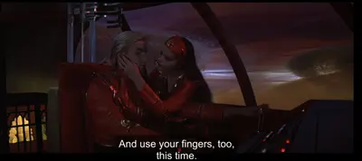 Flash aims the shuttle at the moon of Frigia in order to force Aura to let him use the telepathy-phone to communicate with Dale. Dale’s tripping balls on her pleasure elixir, which is maybe why she doesn’t realize that Flash is fully making out with Aura while he’s thinking instructions at her.