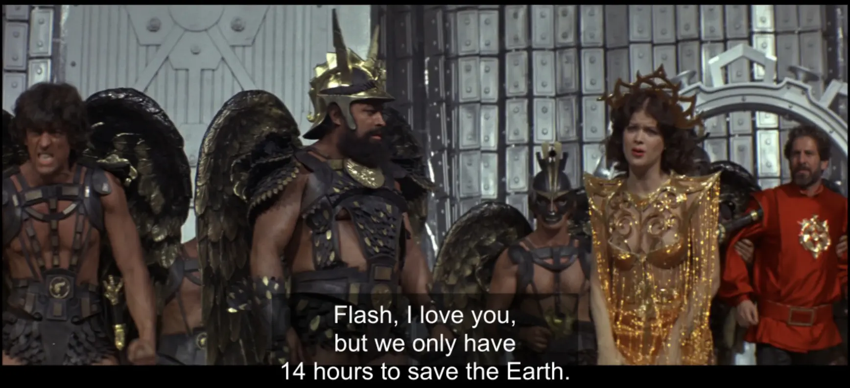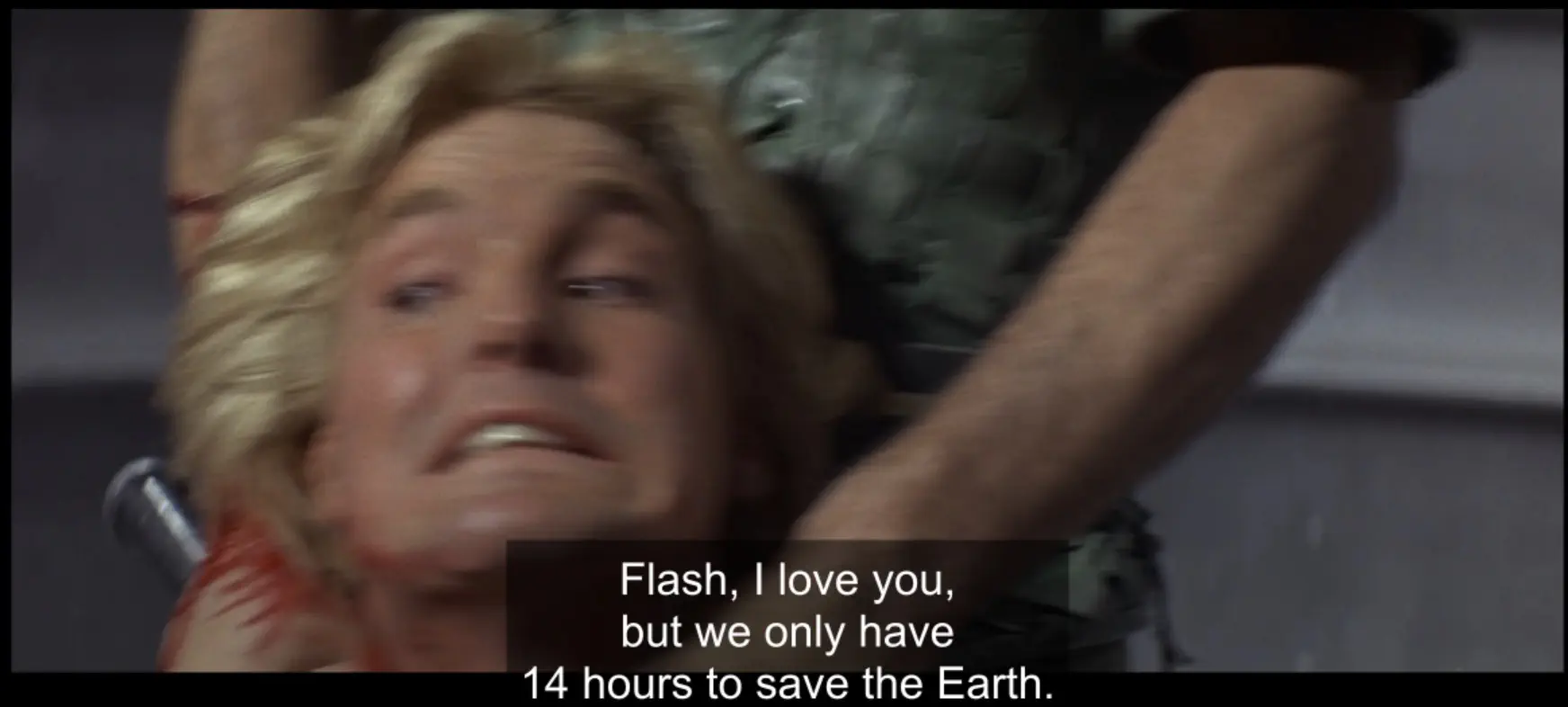 The platform they’re fighting on starts tilting, and spikes come out of it. They fight with whips while the crowd chants things like “Die! Die!” and “Kill! Kill!” Vultan shouts things like “Vultan! Vultan!” and Dale shouts things like “Flash! Flash! I love you! But we only have fourteen hours to save the Earth!”