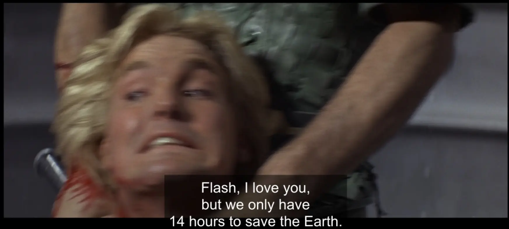 Fifteen seconds till the destruction of earth! In an exchange that takes a lot longer than 15 seconds, Flash demands Ming stop the moon from crashing into Earth, Ming refuses, and using the ring he was about to put on Dale’s finger, beams himself… elsewhere? The ring falls to the floor, the timer counts down, the floating globe arrives to announce that Earth is saved. Flash has saved everyone of us, just like the song said. Except for all the people he killed along the way.