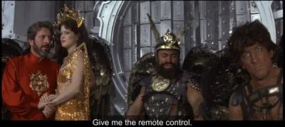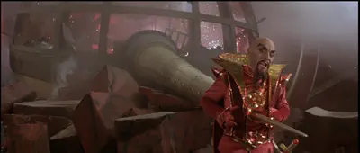 Meanwhile, Flash seems to be riding his ski doo straight at Ming’s palace, taunting a big cruiser to chase him - straight into an ambush of hawkmen! A fight ensues. Queen plays most triumphantly. Vultan and Flash take over the cruiser. There’s only 3:24 until Earth is destroyed—but Queen just started playing wedding march over the radio! Weird that the empire of Ming has the same wedding music as Earth.