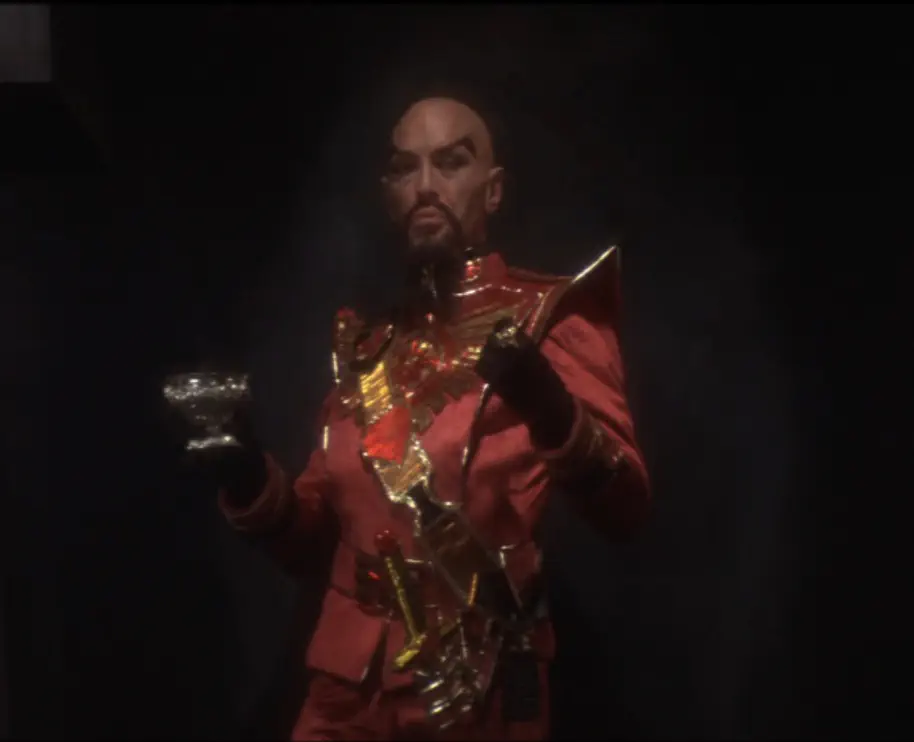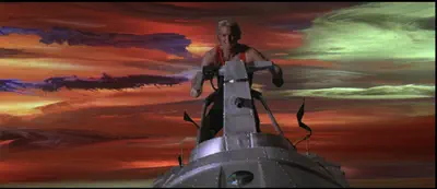 Barin pledges loyalty to Flash and starts to give a rousing speech. But right at that moment, Klytus arrives in his flying coffin. He insults everybody, and tells Barin about torturing Aura (“she seemed to find it quite enjoyable”) and in retaliation Barin and Flash throw him onto the spikes of the platform. There is a very gross practical effect of his eyes and tongue popping out of his mask for some reason.