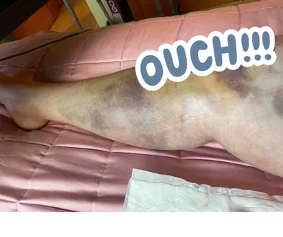 Anyway. Pain sucks! Check out my post-surgical bruises. (I covered up my gnarly incision for those of you with weak stomachs.) In another week I get to start re-learning how to walk again!