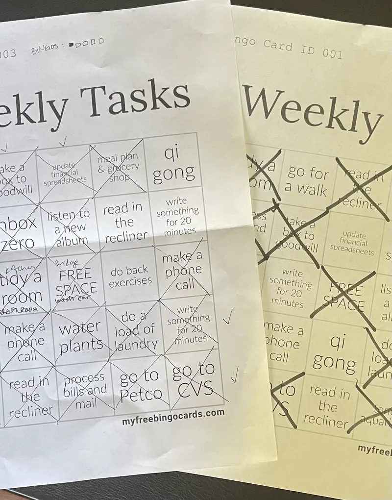 Some day I draw slips from the jar to find out what I’m going to do that day, but other days I just look at the boxes and see what I can fit in, and what will get me closer to a Bingo. And what do I win if I get a Bingo? I haven’t even figured that out yet. I’ve just been doing it for the sense of accomplishment.