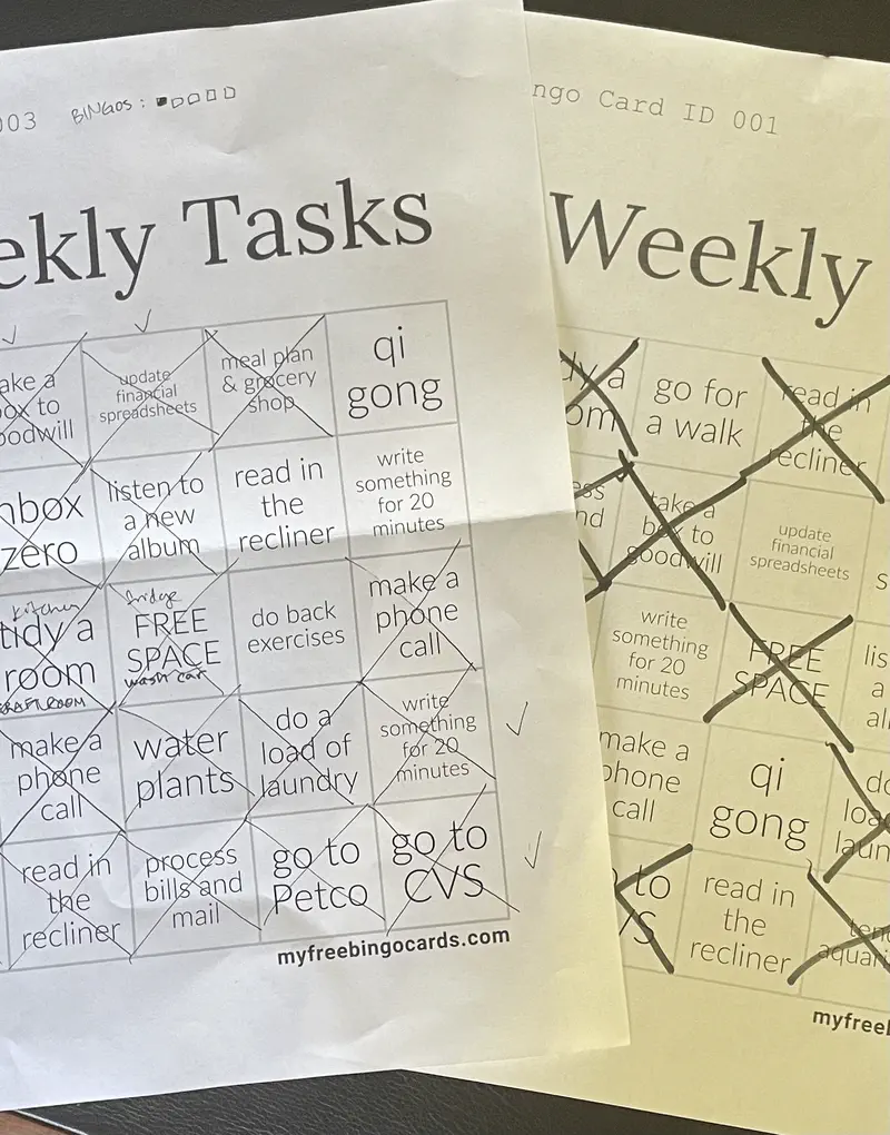 I made a list of things that need to get done on a weekly basis—chores, errands, self-care. I added in a few things that I enjoy doing but usually neglect in favor of scrolling on my phone.