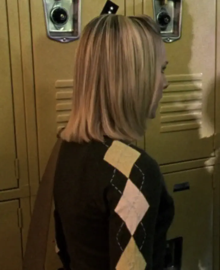 Army green sweater with pink and yellow argyle down the sleeve and nowhere else, worn, of course, with extremely flared jeans.