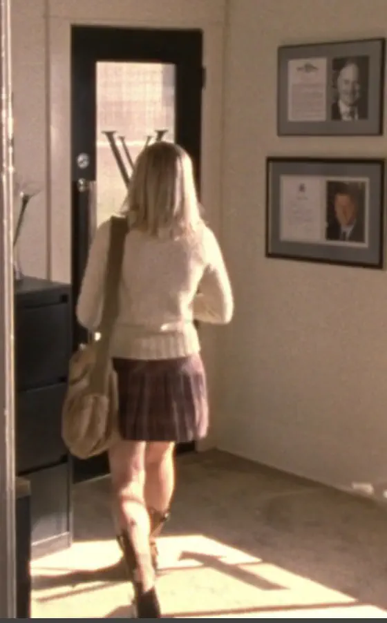 Pretty dull episode, clothes-wise. I’m going to call it a tie between the mini pink plaid miniskirt and cable knit cardigan combo that V wears to Vinnie’s office (which you can only really see as she’s walking away), and the dress she wears to the incredibly dark party. I think it’s plaid, and it has a weird flower on the shoulder. It’s difficult to get a good screenshot of this fit because THE PARTY IS SO FUCKING DARK.