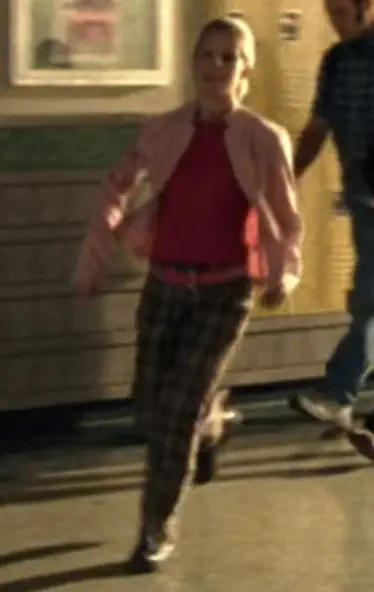 Plaid flared pants, fuchsia top and a pink blazer with a hot pink belt. We only get a brief glimpse of the entire ensemble as Veronica chases Meg down a hallway.