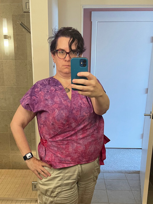 I finished the wrap shirt! The fit's a little awkward--I think I mis-measured, or gave myself too much ease, but the garment is a bit too wide. And the stiff fabric--it's quilting cotton, which doesn't drape as well as other types of cotton--results in the sleeves sticking out in a weird way. I like the way the hombre fabric turned out, but in reality these colors are a little bright for me and don't fit in with the current old-man/fifties-nerd aesthetic I'm building. But it was fun to make and I learned a lot. I'm definitely going to make this pattern again and refine it for my fit and style.