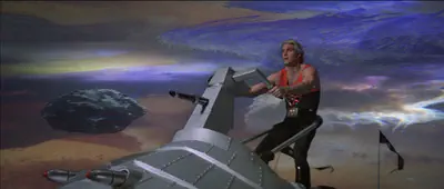 Meanwhile, Flash seems to be riding his ski doo straight at Ming’s palace, taunting a big cruiser to chase him - straight into an ambush of hawkmen! A fight ensues. Queen plays most triumphantly. Vultan and Flash take over the cruiser. There’s only 3:24 until Earth is destroyed—but Queen just started playing wedding march over the radio! Weird that the empire of Ming has the same wedding music as Earth.